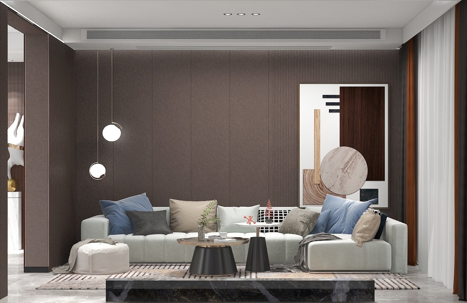 柔软舒适的布艺沙发,保暖恒温的地毯搭配两个高低不一的茶几,精致美观。 后面的背景墙也很有设计感,几何图形的拼接让空间更有质感,垂下来的吊灯给客厅增加了几丝温暖。