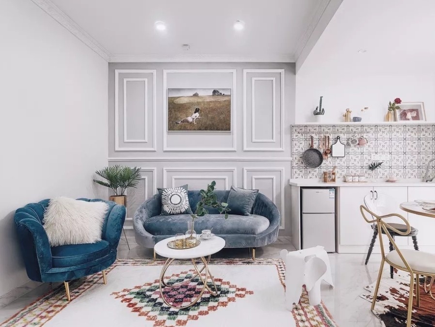 美式风地毯搭配湖蓝色沙发,以及精致耐看的美式茶几,很***的配色,整体空间不会很单调。