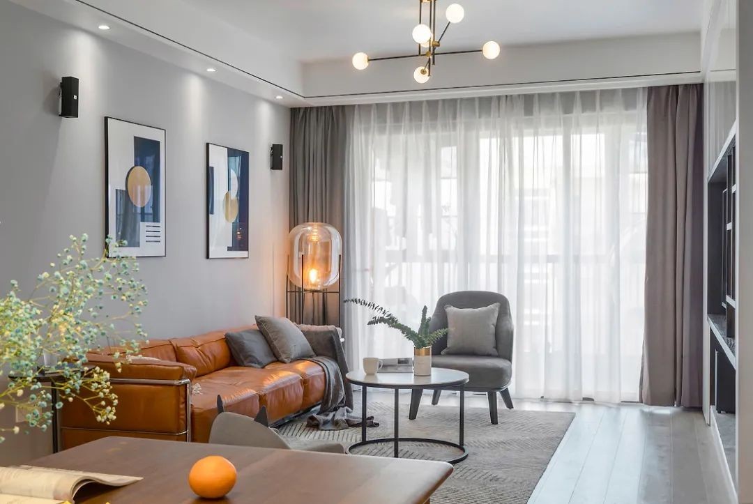 整体以灰色为主,亮色沙发做点缀,整体协调舒适