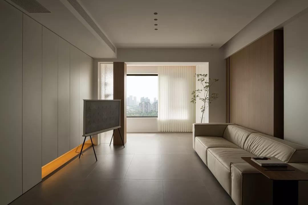 选择与主流相背驰的设计手法,通过对电视墙体的单一塑造,找到留白中蕴含的包容力。