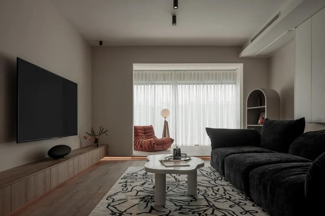 客厅米色漆的沉浸观感、木质的温暖恬静,和不同质感的几何体块家具融合,营造出自然、宁静的纯洁空间。