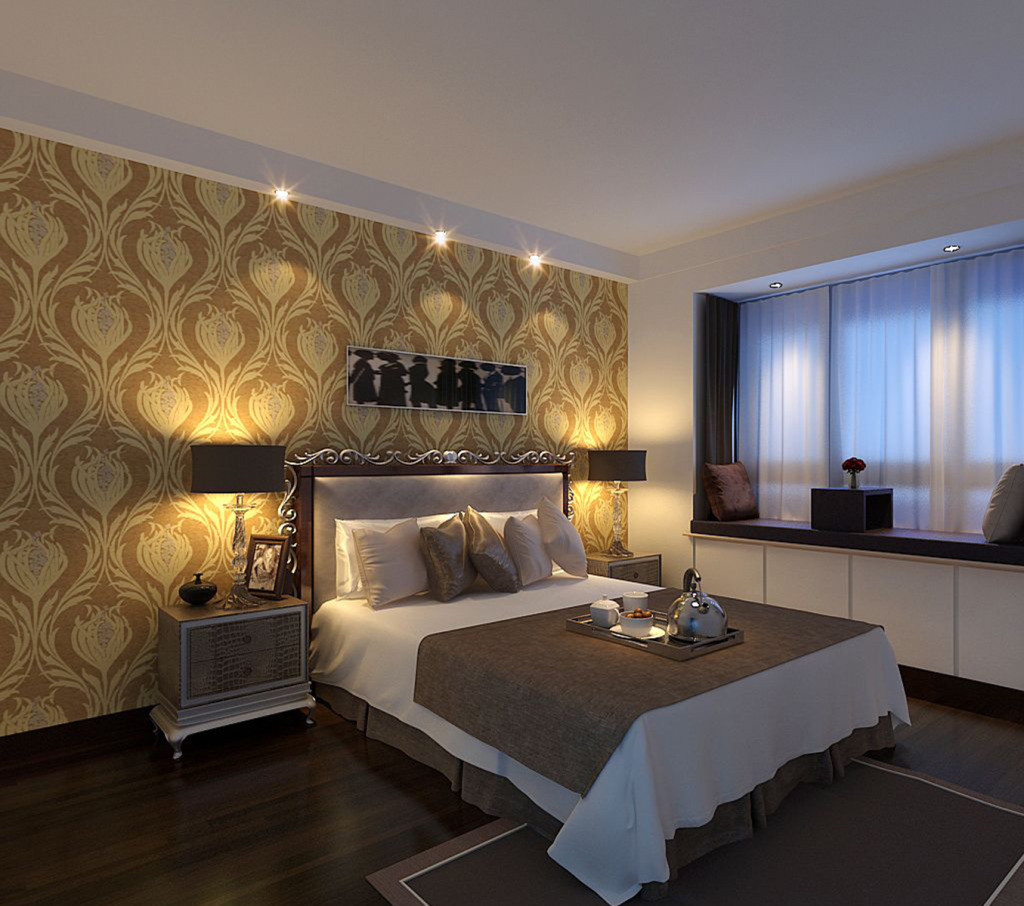 金色背景墙搭配上盛放的花纹 几个无主的小灯挂在 边上 黑色的边框飘窗 白色的墙壁 在告诉着世界 失去的东西 我们要亲手夺回