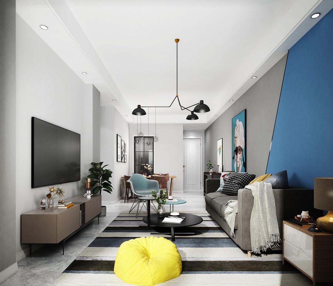 本案客户说:户型家家都差不多一样,没什么特色,所以希望通过设计让我有一个不一样的家,舒适度高一些。站在客厅的角度一眼望去,在分色墙和灰色色窗帘的衬托下层次分明匀称。分色墙取代了复杂的背景墙是整个空间简约而不简单。