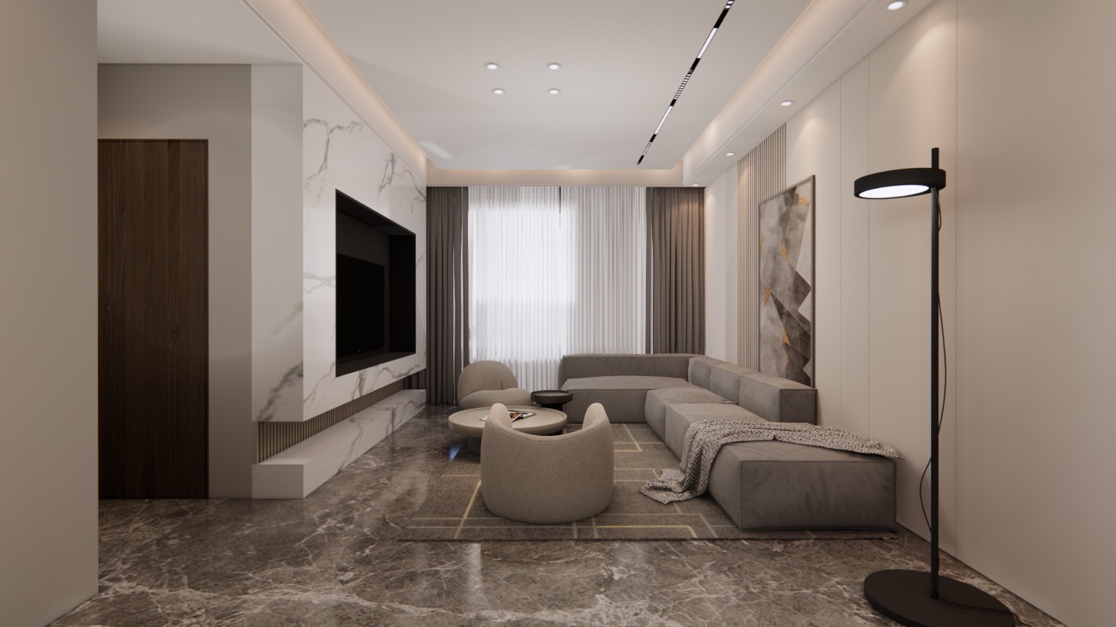 客厅吊顶采用无主灯设计,沙发选用浅灰色,客厅灯色温在3500K,电视墙采用简单的地台和岩板相结合。