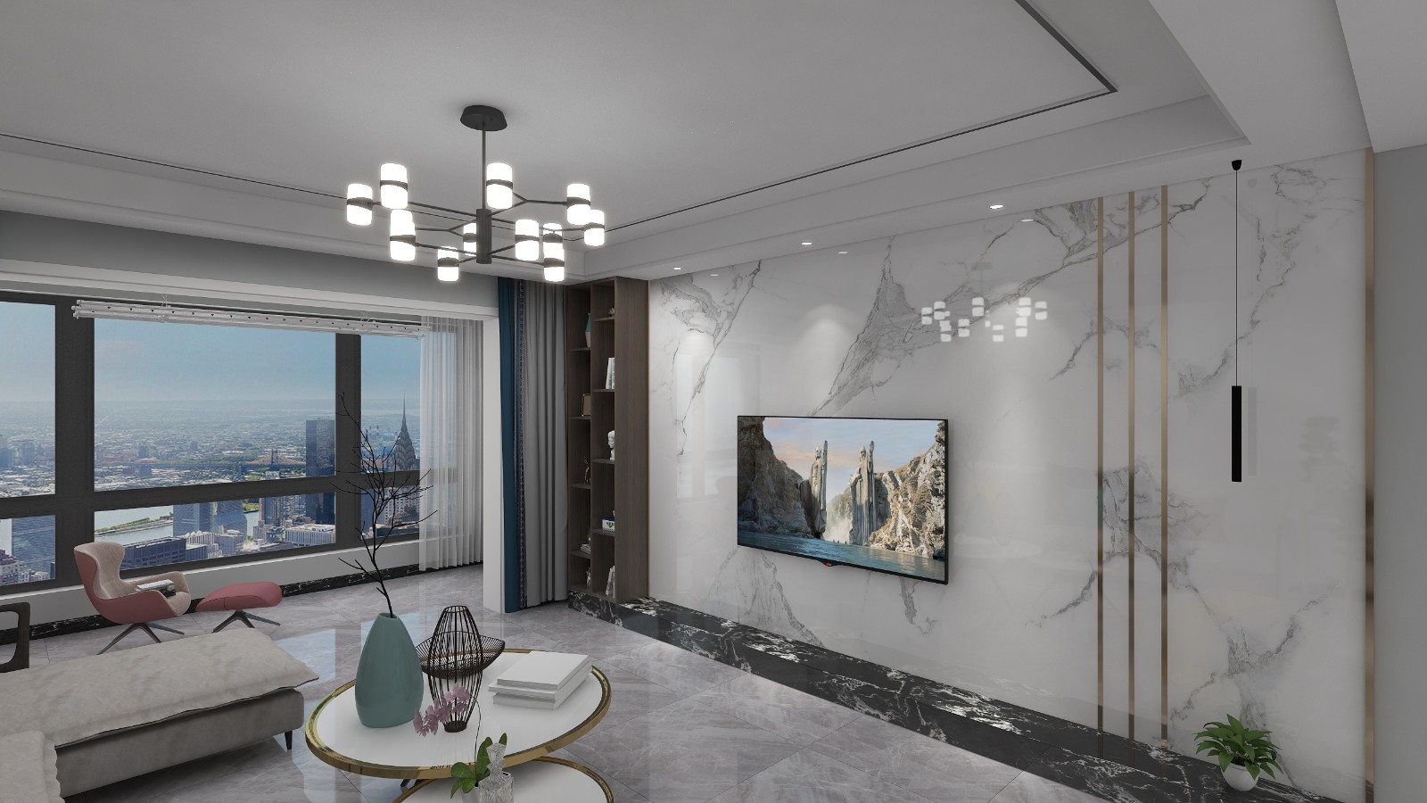电视背景墙,展示柜及岩板搭配设计。