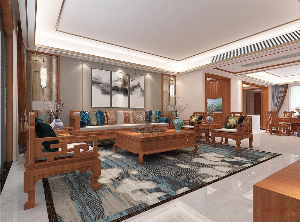 客厅的整体格调让人眼前一亮,引入眼帘给人一种端庄厚重的空间气度,依托红木家具,让客厅洋溢着浓郁的中式人文文化。本身空间就大,加上无主灯的设计,让空间更加的敞亮了。