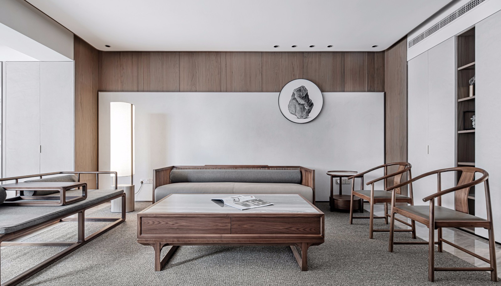沙发背景墙用浅灰色手工漆做了简约的几何屏风造型,用木色温润的胡桃木KD板做背景衬映