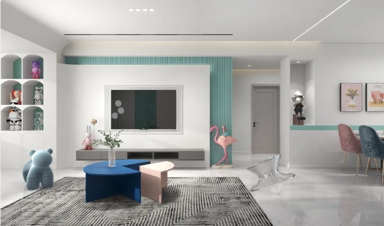 全屋采用的是无主灯简约设计。业主是年轻一家三口。女业主是浪漫主义者,全屋主色调很浅,采用鲜艳色彩进行跳色。