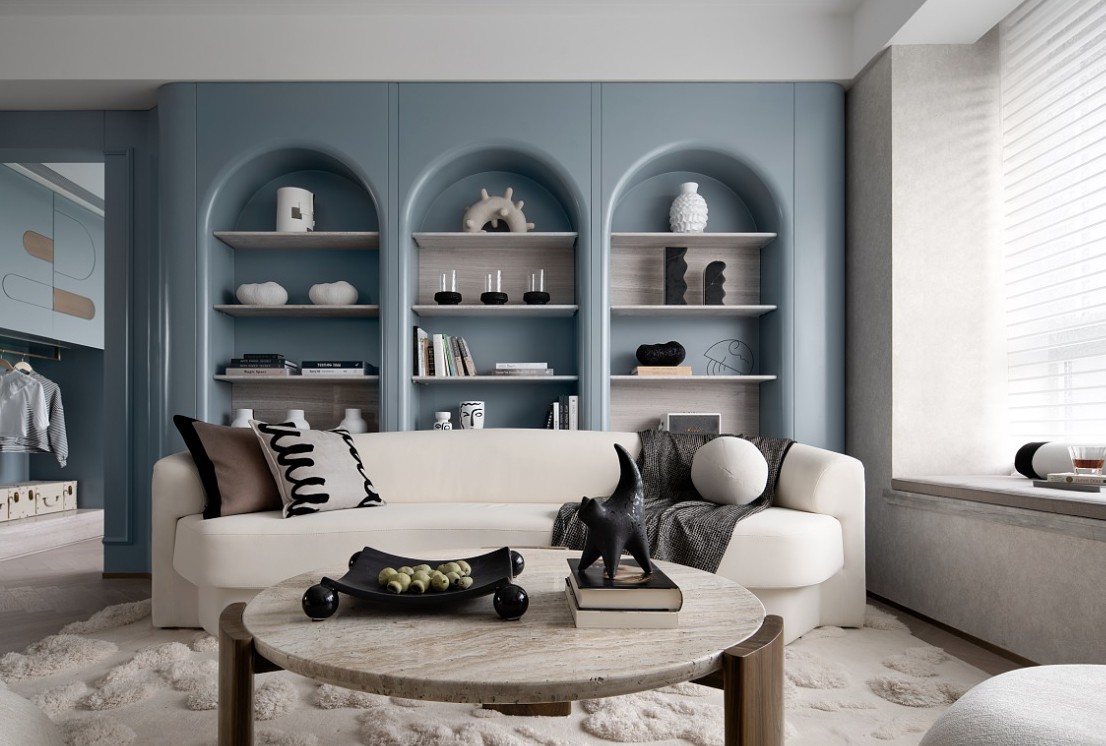 本案明亮、简约、干净是对家的基本期许,具有度假感和法式风情的基调刺激设计灵感。正如我们欣赏艺术时能体会到的广阔自由,我们希望通过软装设计打破风格边界,带入一种无界且多元的气息,以开放的视觉语言重塑生活的精神内核。设计师通过材质创作,糅合绒面、皮革、原木、织物等肌理感极强的饰品、家具,弱化风格界定,拓展现代居所的审美领域,留存自我底色。