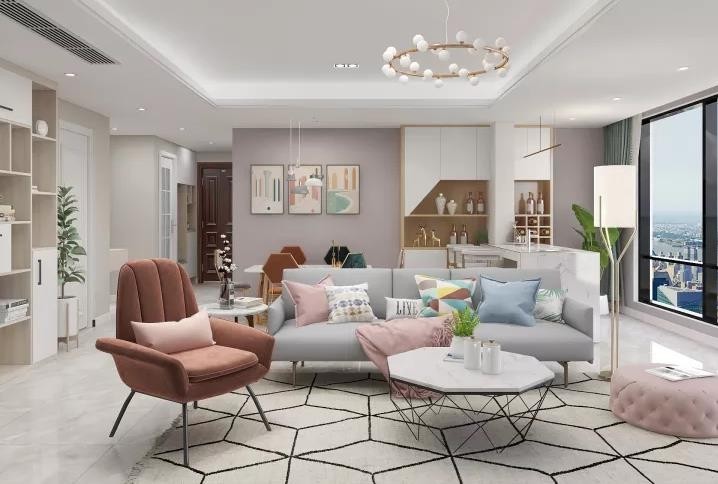 客厅背景墙采用两种颜色,木制的地砖,温暖的灯光,搭配浅色的沙发,整体充满温馨感。