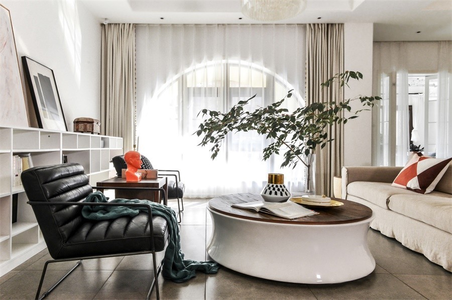 客厅整体采用温柔的配色, 大面积暖白色给这个家奠定了优雅、宁静的基调。 当落地窗遇上拱形门洞的设计, 铁艺造型的座椅邂逅温润的圆形茶几, 整个客厅线条变得灵动了起来, 生活本该拒绝规规矩矩的单调。