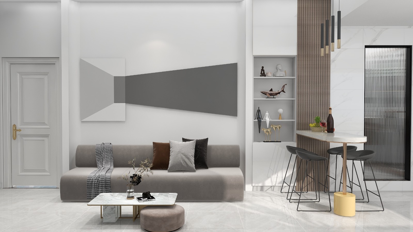 三人位的沙发背景墙做了弧形立柱的造型、体现出视觉上的功能分区。中间刚好腾出一个壁龛展示柜。