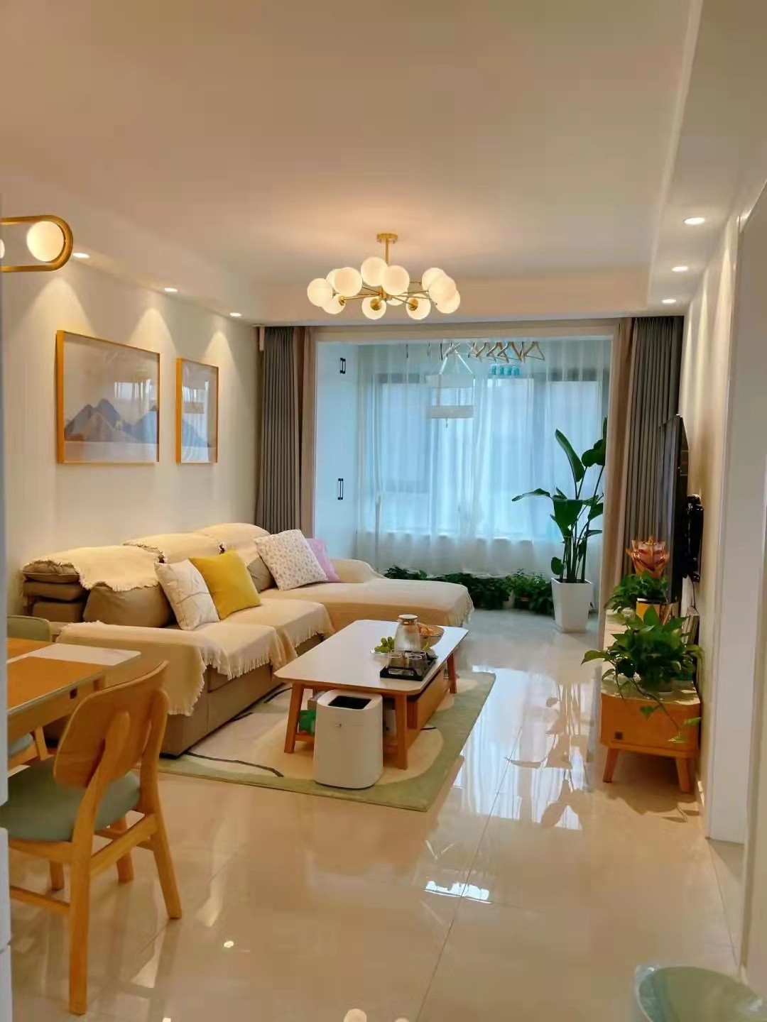 客厅和餐厅严格意义说是在同一个空间,通过布置家具划分两个空间,中间没有做任何的隔断。客厅与阳台打通,增加了很多室内面积,显得空间特别宽敞,室内采光更充足。装修北欧风格,客厅布置了L字形沙发,坐着很舒服,款式真心喜欢。顶面安装的吊灯,晚上照明亮度足够,不会让人觉得必要。整个空间都是黄色调,特别温馨。