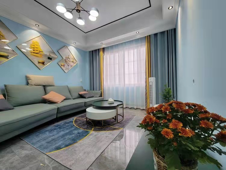 客厅天空蓝墙面搭配豆绿色沙发。非常养眼