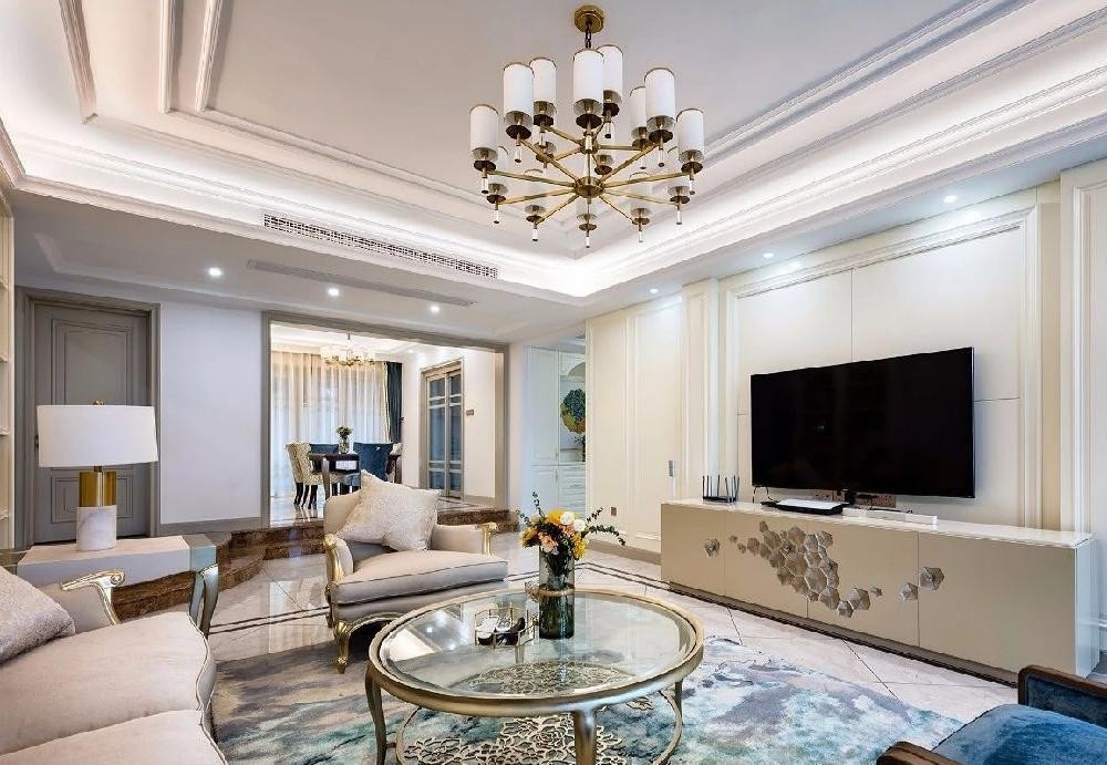 客厅的设计明亮简洁却不失奢华,乳白色的主调呈现出客厅的大气,蔚蓝色单人沙发椅的摆放提升了客厅的实用性,也让整个空间更显优雅沉稳。