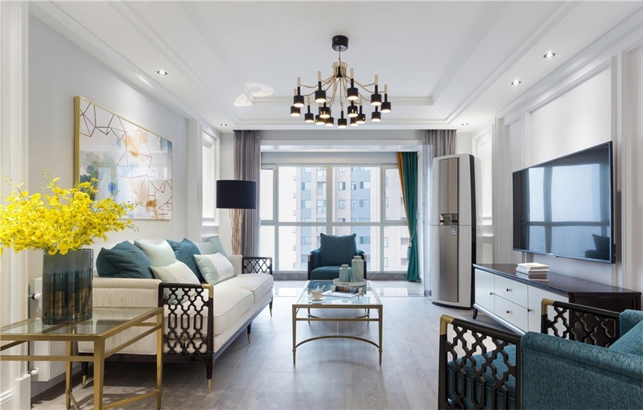 将现代风格的时尚干练与光洁质感,融入简约美式的典雅柔美与温馨氛围;纤细黄铜的优雅弧度在恬静灰蓝基调中轻盈勾勒,使全案呈现出美式轻奢的摩登都市品味。