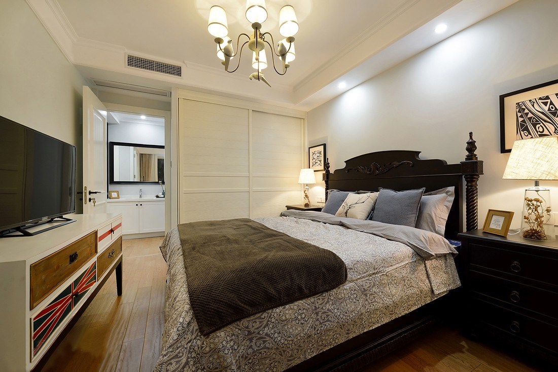 主卧整体色调偏向豆沙绿,给人很舒服的感觉,很有助于睡眠。同时搭以黄色为跳色,使整个空间不至于沉闷。整体到顶的大衣柜也满足了业主收纳衣物的功能。