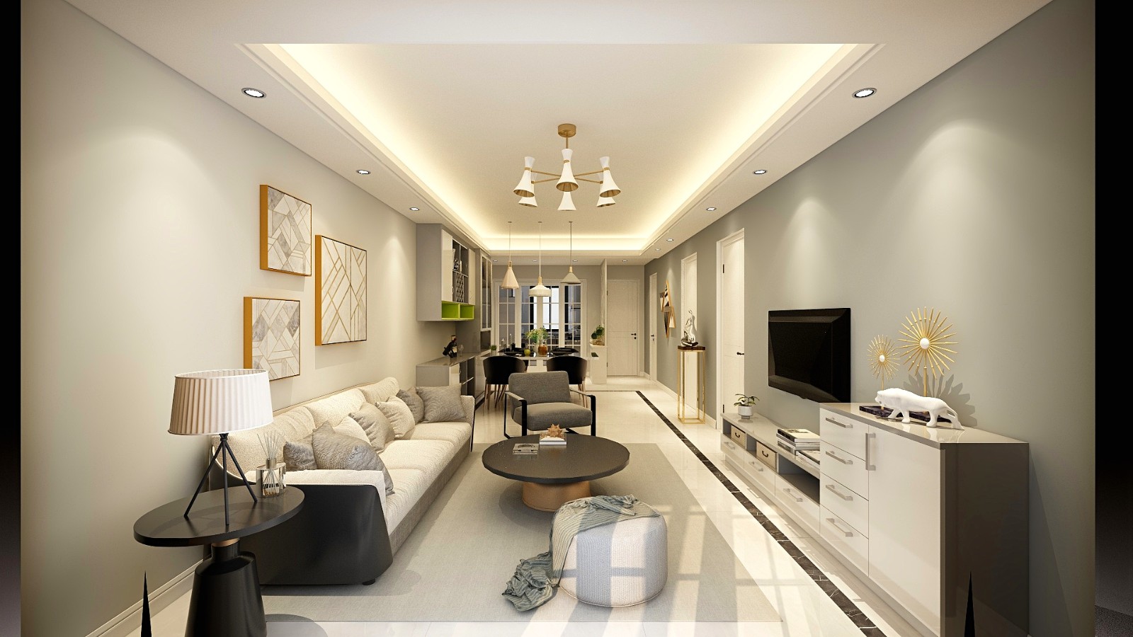 将阳台空间归纳至客厅,光线和自然更加直接的和我们相融,视觉上也放大了尺度。落地窗和大量柜台,增加功能性,让洗衣机、烘干机、冷饮冰箱内置隐藏,使得空间简约宁静。装饰画的运用,在色彩、肌理、尺寸上的考量,起到烘托和平衡空间调性的功能。