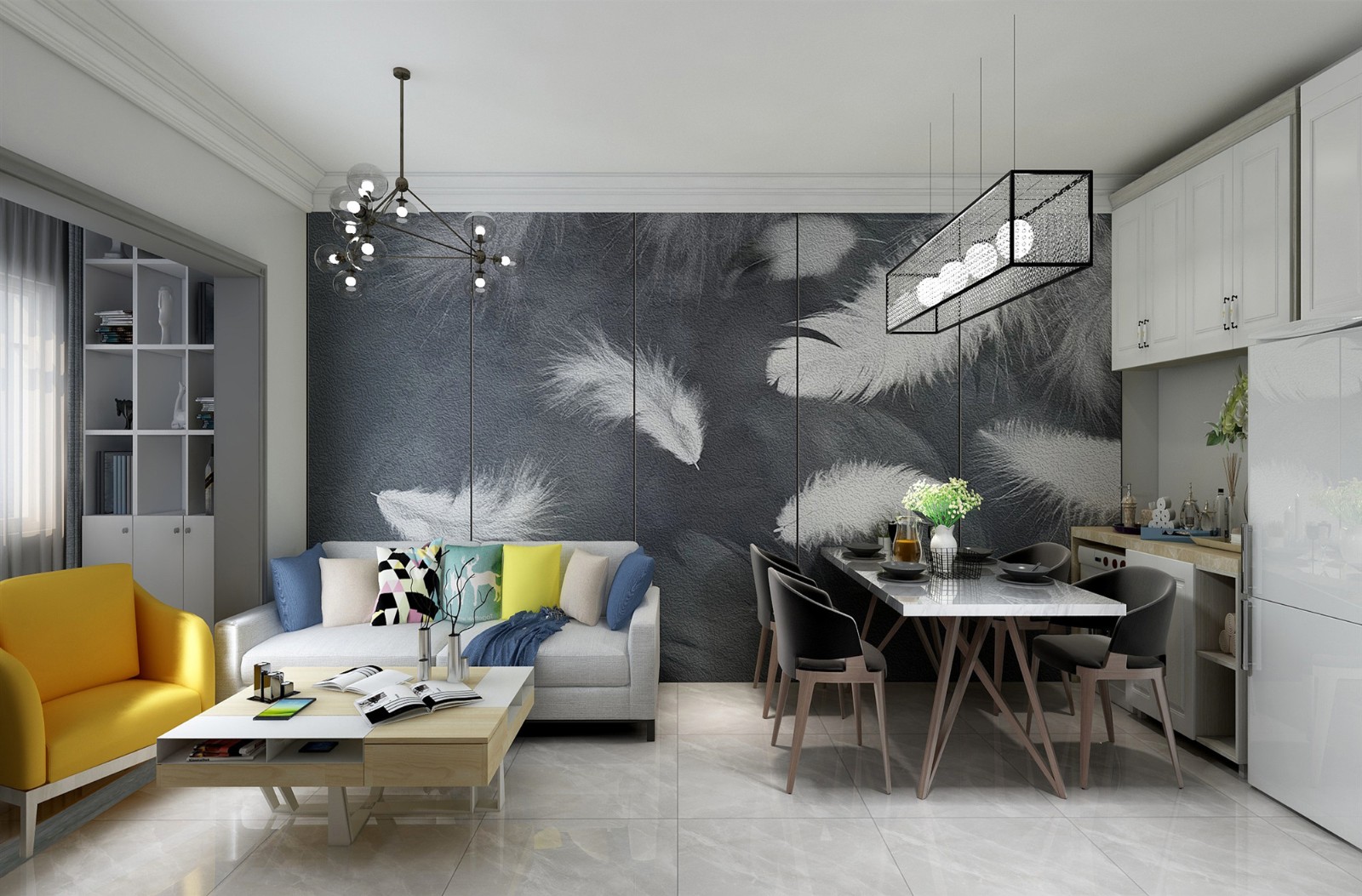 客餐厅作为家庭的公共区域,选用了灰色地砖铺装,耐磨好打理。沙发背景墙选用深色壁纸,打破常规,运用不规则排列为背景,构架彰显独特,不羁,时尚。客厅沙发色彩的活力点缀着生活如诗词般,一本杂志一杯咖啡能赖一整天,让空间停留享受家的温馨与惬意,细腻流畅的纹路和纯净色泽让人有那么一瞬间从喧嚣的尘俗脱离出来的感觉。