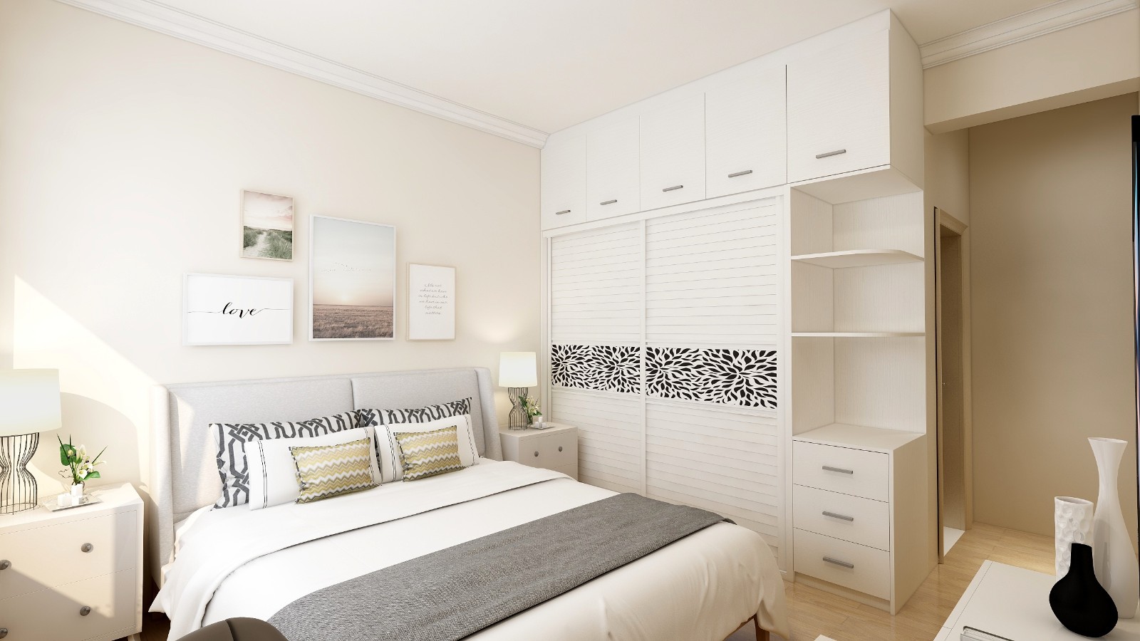 主人房墙面米色搭配原木框加白色门板,温馨恬静。