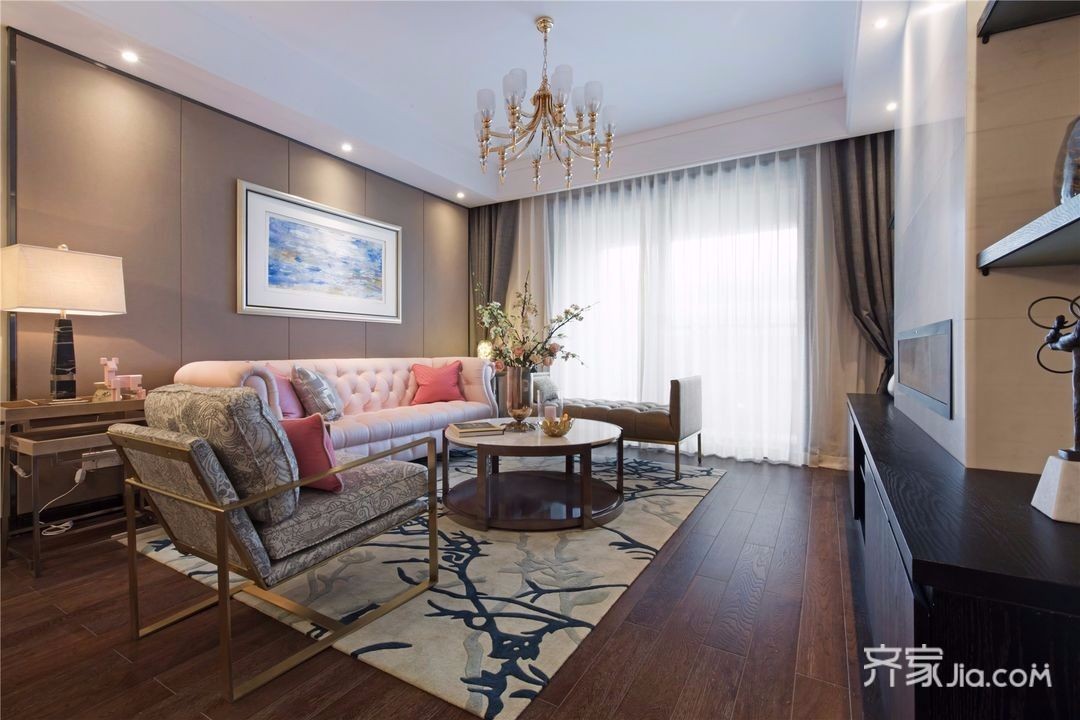 客厅空间大,美式沙发,再搭配中式小摆件,毫无违和感,非常美观。