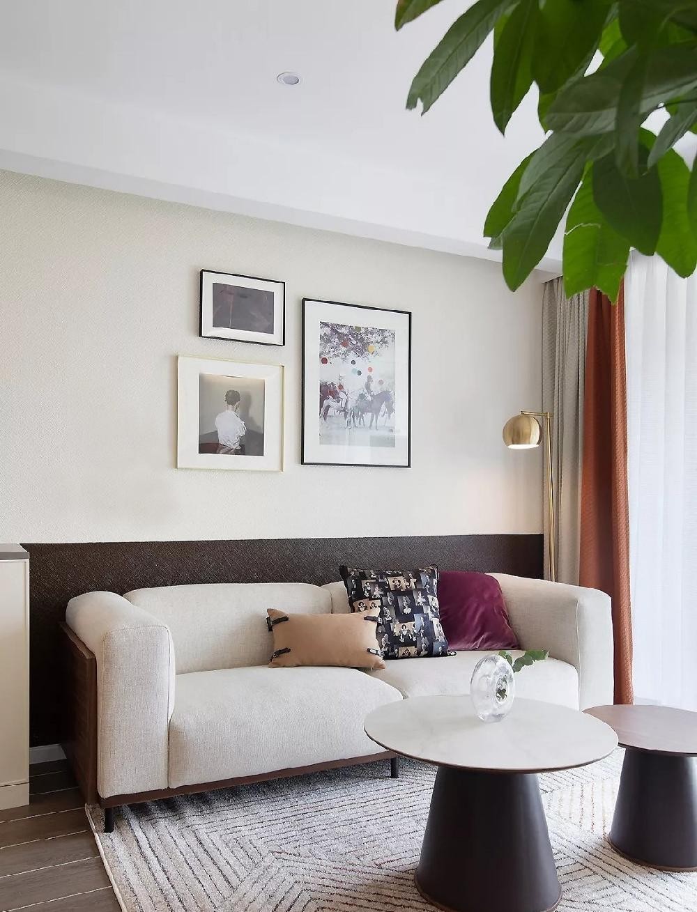 客厅,一高一低的圆形茶几,分别采用爵士白和胡桃木的桌面,搭配复古文艺的抱枕和双色窗帘,让小空间也能充满细节的魅力。