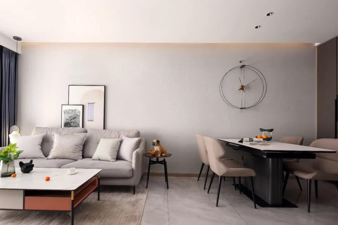 视线随着客厅延伸,墙面上的装饰画与客厅的颜色交相辉映,虚实相生。墙面材质的肌理变化,营造出舒缓的空间韵律与节奏,隐现设计美感。
