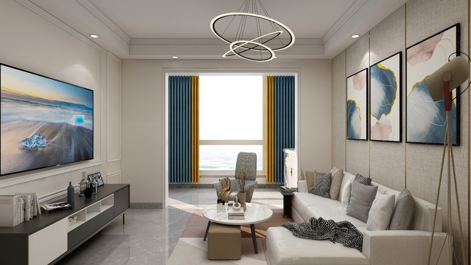 客厅主要以白色为主还有白色的岩板茶几和白色的沙发相配,做了一组边吊