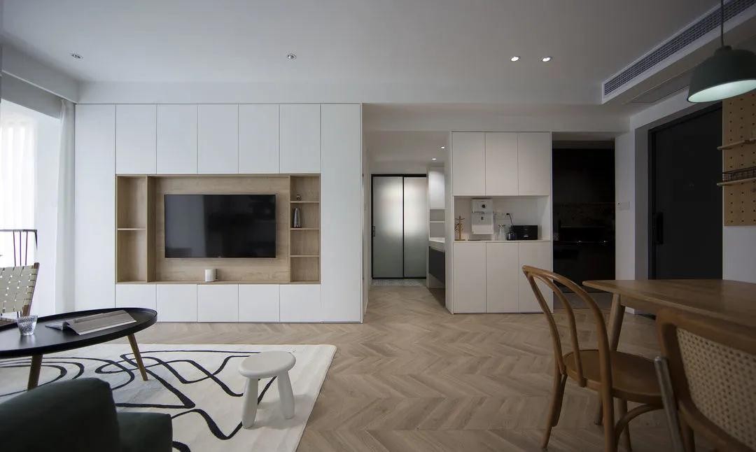电视墙直接定制整面柜体,提高客厅收纳能力。封闭式与开放式结合,白色和原木的交替,不仅视觉不呆板,还更有层次性。封闭式的柜子,以纯白烤漆门为主,取消了门把手设计,平整美观。中间过道也是改动***的地方,优化了居家动线,实现了三分离卫生间。