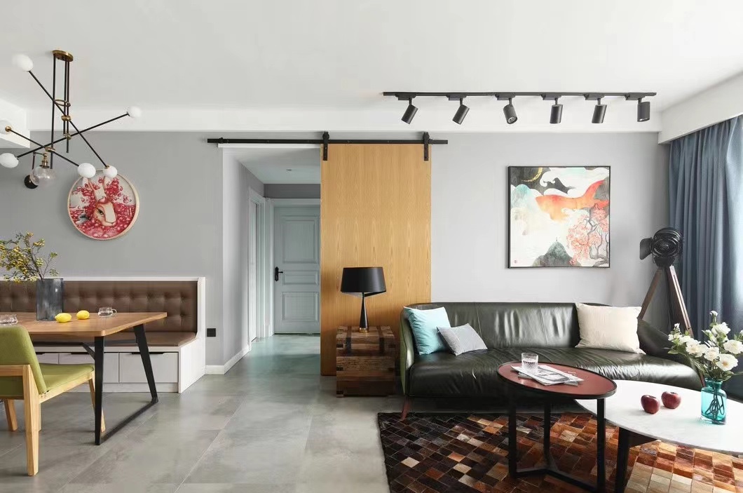客厅设计沙发后简单的谷仓门遮挡了原有强弱电箱,整体不拘风格;