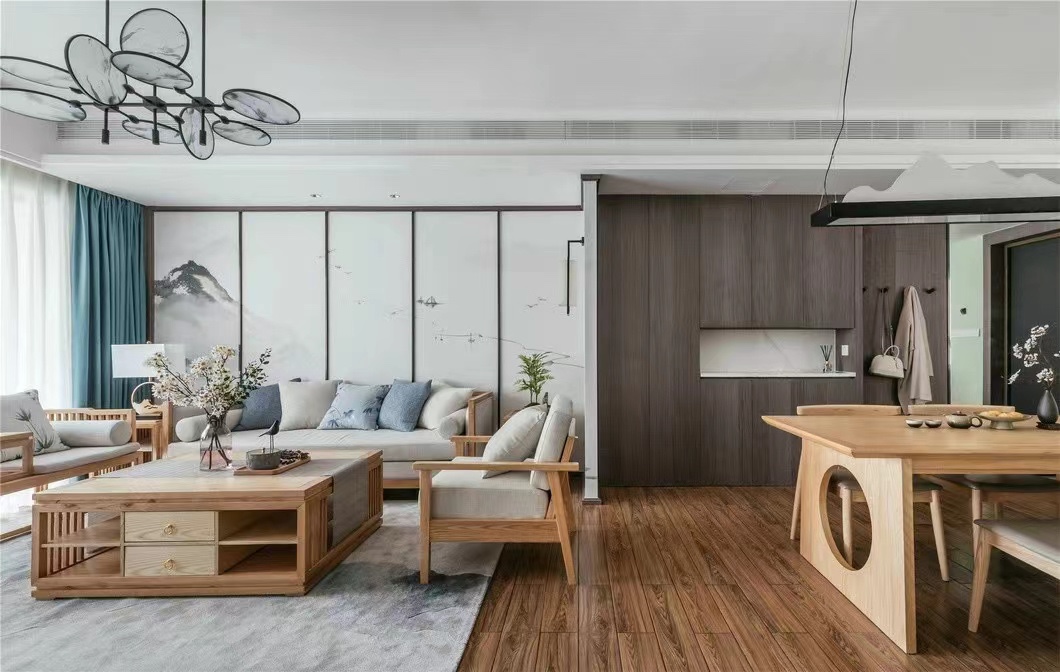 客厅与茶室想通互动,互相独立又互相连接;正午选用原木色家具,淡雅温润;