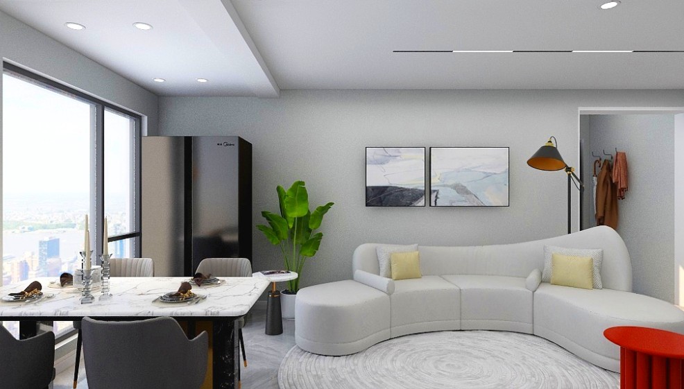客厅无主灯设计,吊顶对称安装磁吸灯,实用美观不突兀。 白色的圆弧形沙发,搭配白色的羊毛地毯,传递出宁静优雅的质感。