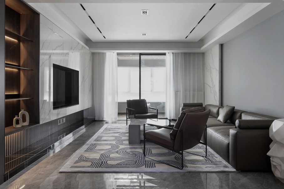 电视背景用不对称式吊柜,满足开放展示的同时又增加了储物空间。柜体与隔断结构在空间上相互呼应、相互衬托。电视内嵌,电视地台采用劳伦黑金大理石,彰显质感,后部波浪板增加层次感。