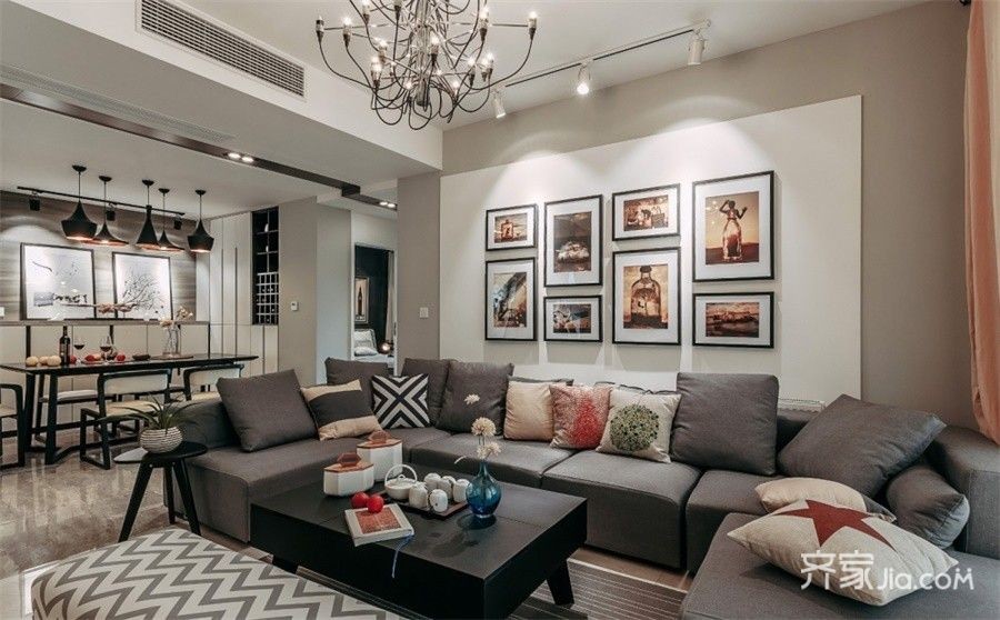 灰色的亚麻沙发配合不同图案的抱枕更显活泼与柔软,墨黑色的茶几彰显冷静格调,从墙面到茶几的色彩单一,目的是让软装饰品更显丰富细节之美