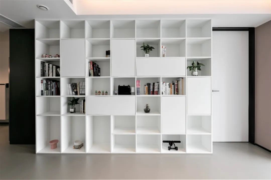 客厅整体通透明亮,取消沙发、电视柜,根据屋主需求改为双人书桌+巨型书架