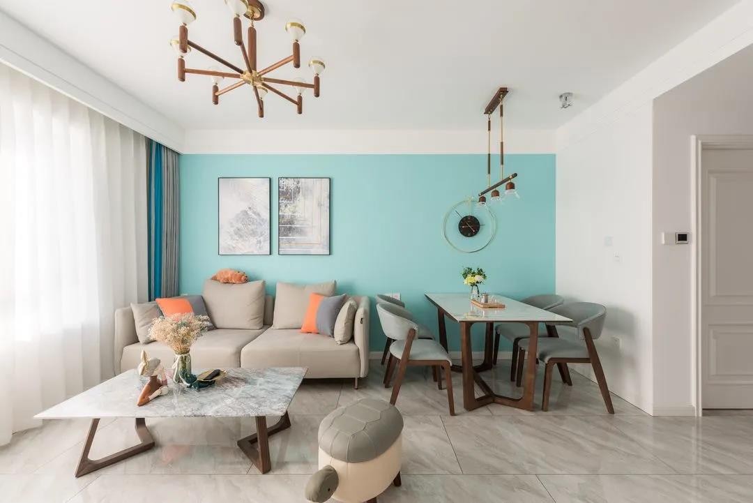 客厅面积不算太大,以简洁轻快的设计,改善视觉效果,从而提升空间感。蒂芙尼蓝作为背景墙的主色,清爽时尚且活泼。客餐厅开放一体,不仅提高空间利用率,还让空间动线更加宽敞舒适。