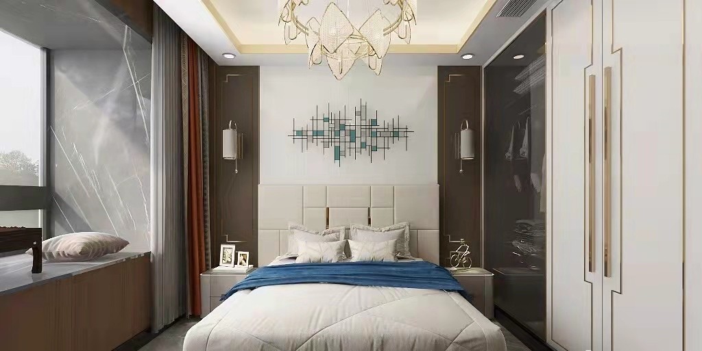 设计将原本不规则且略显零乱的天花加以简化整合,改变后的主卧空间呈上升之势,置身其中给人积极向上之感,表现业主对快乐人生的追求;