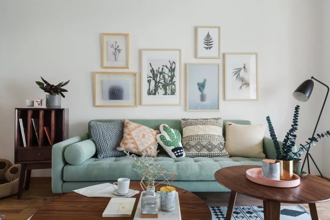 客厅的沙发选择了亮色系的,再加上沙发背景墙上的绿植装饰画,让客厅不会那么单调,多出了一丝文艺小清新的感觉。
