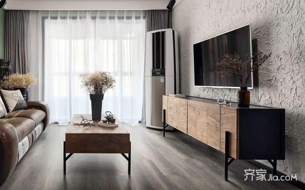 整个空间既有温润的木质,又有帅气的铁件,还有复古的做旧皮质,搭配周边墙面材质变化应用,电视背景墙采用了腻子基层拉毛处理,可以不加修饰的墙面纹理有别于一般墙面的光影层次,简单粗犷之感油然而生,展现了工业风特有的雅痞质感。这样一个结合了北欧风与工业风的混搭个性空间,呈现出一种独特的美感。