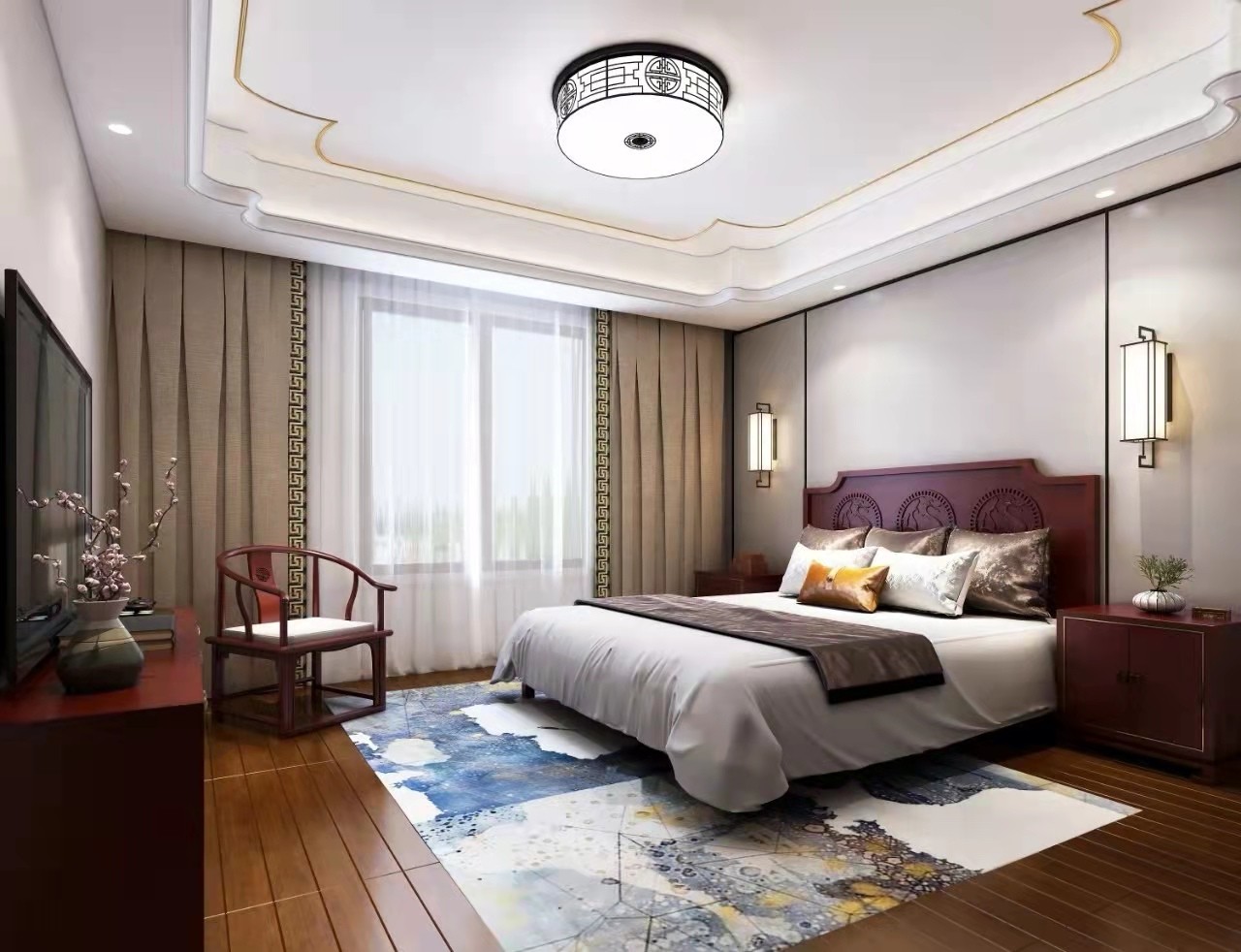 卧室在现代的装修风格中融入古典元素。它不是“1+1=2”的简单堆砌。而是设计师根据经验、驾驭设计元素的能力以及对所面对的业主的深度分析后得出的一套“量身定制”的方案。