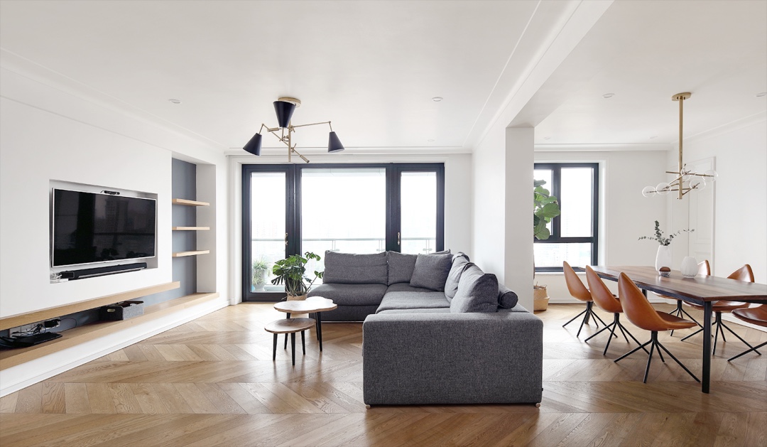 ▲沙发有一半靠墙,另一半对着餐厅区域,相互打通的客厅与餐厅,在鱼骨铺的木地板空间下,显得简约自然而舒适。