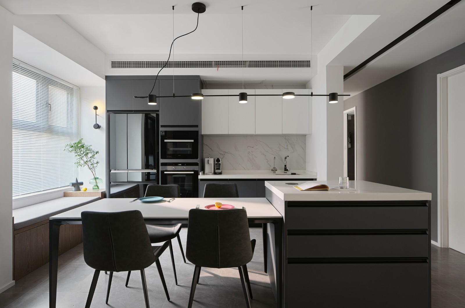 原本三房两厅的户型,大横厅的设计让空间更加的开阔,但考虑到入户门厅的空间相对比较局促,无法满足正常的餐厅所需空间,所以将南面隔出一间卧室,北面次卧舍弃扩大餐厅空间,中厨和西厨分离减少公共空间的油烟问题也满足了业主对于餐厅和西厨的钟爱。入户门厅与北次卧的打通,增加了岛台设计同时也减少了入户门厅的拥堵感,空间更加地开阔,餐厅与厨房紧邻也大大缩短了家务动线。主卧的舒适度是设计之初考虑的重中之重,切割了南