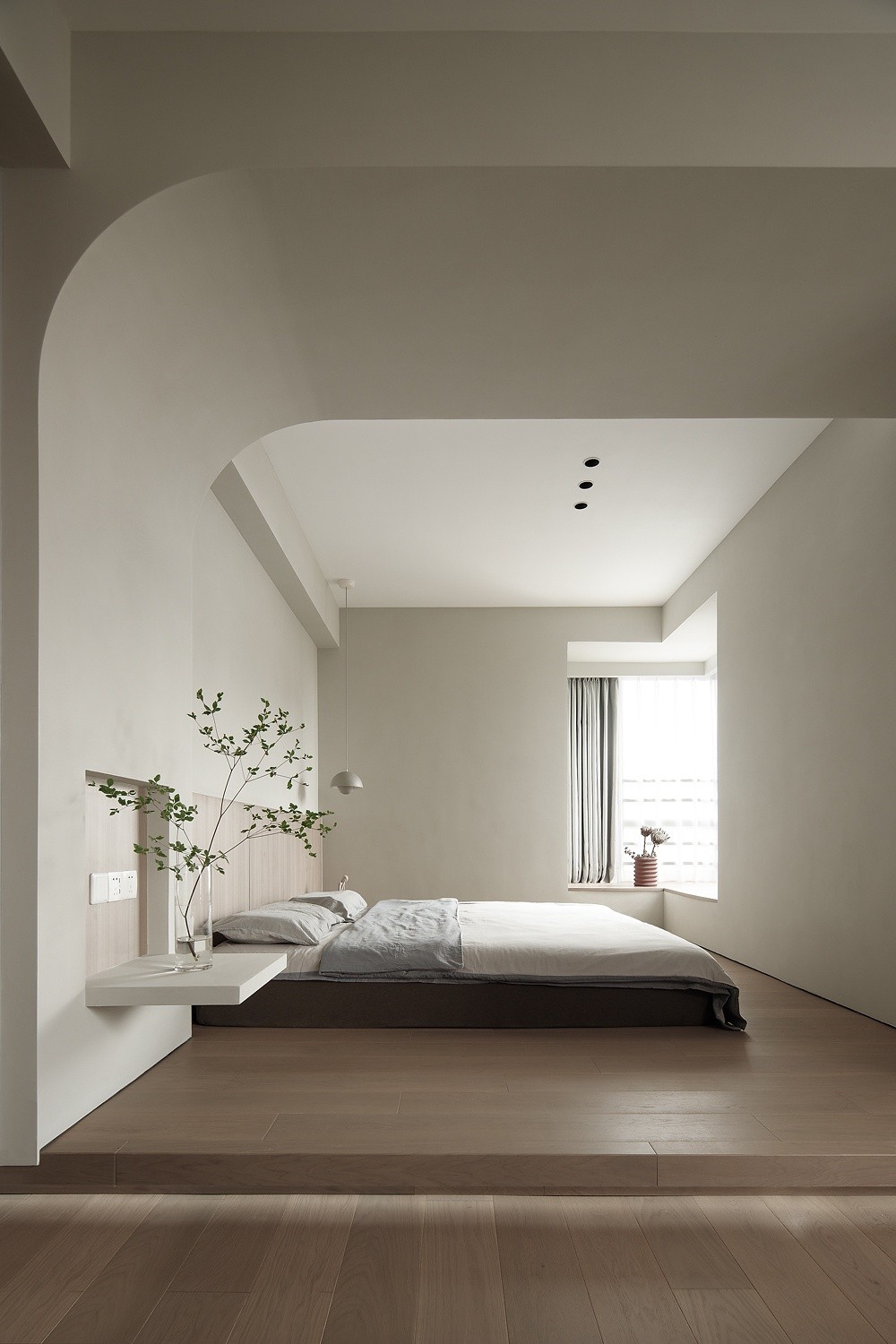 几何的块面、弧度在空间之中交错、对比,达到美***衡层面的曲直比例。利用地台,营造一种”拾阶而上”的安寝仪式感。