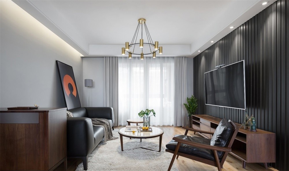 电视背景墙采用木塑材质,干净、利落,产生了一种独特的硬朗美!