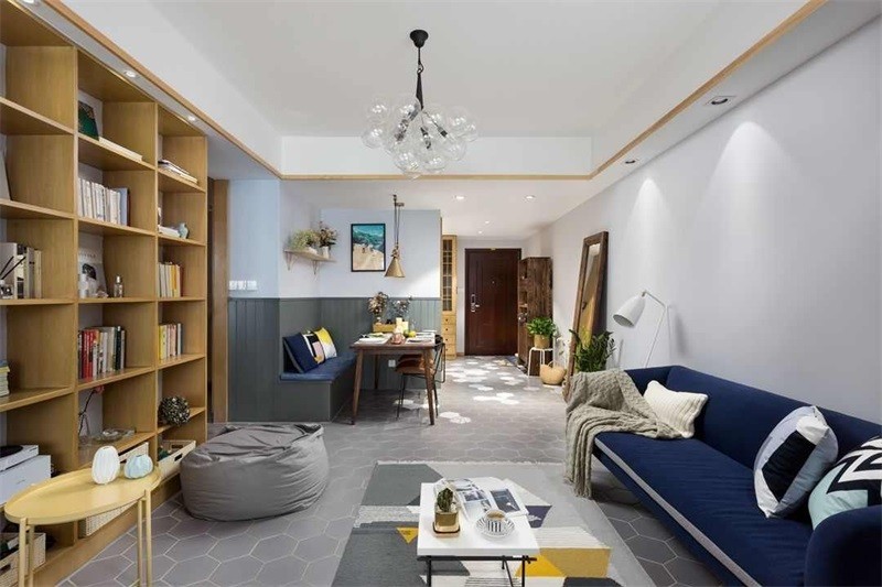 因为是开场式厨房,所以客厅和厨房都选用六角砖铺贴,为了让整个空间有跳跃性,在两个区域的衔接处用了些跳跃的花砖,明朗有趣。