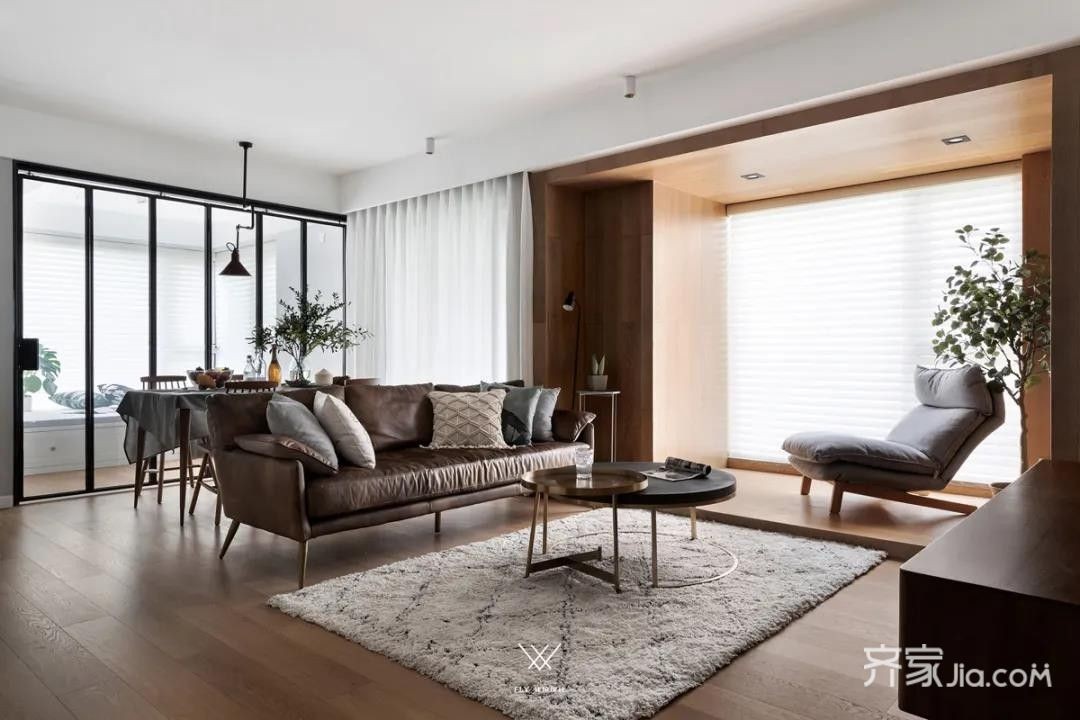 客厅的阳台一分为二,把生活阳台与休闲阳台划分开来,避免坐在客厅的时候可以看到阳台晾晒着的衣服。客餐厅中间摆上棕色皮沙发,在简洁自然的客厅空间下,呈现出一种自然舒适的轻松感。