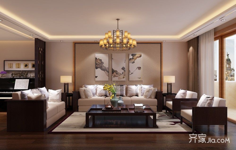 本案设计中将中式元素与现代元素完美融合,把传统过于复杂和讲究的中式造型提炼并赋予其更强的设计感,更注重空间的渗透与互动关系,借设计师娴熟的设计手法,虽然没有那种明显的中式痕迹存在,但依旧能明显的感受到一股中国风迎面扑来。黑、白两种清雅颜色为主调,融入书法画、中式吊顶、鸟笼灯、陶瓷,现代中式花格等装饰性元素,撷取精神内涵,改造线条、转化象征,使其融会于空间之中,铺陈全新的中式风格。