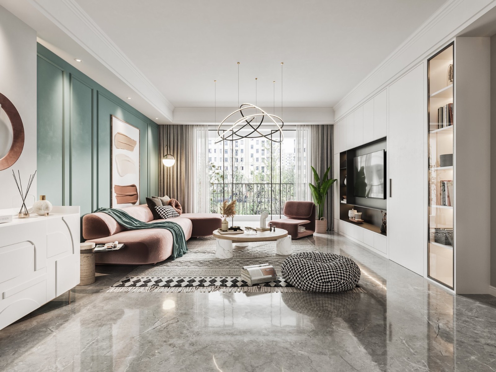客厅的整个色调分为沙发背景墙的绿色,低调中又带点清新;吊灯的纯白色,干净大气;地板上的浅灰色加上灰色的地毯,三个颜色形成三个块,地板砖的拼接方式拉伸了客厅的纵深感。