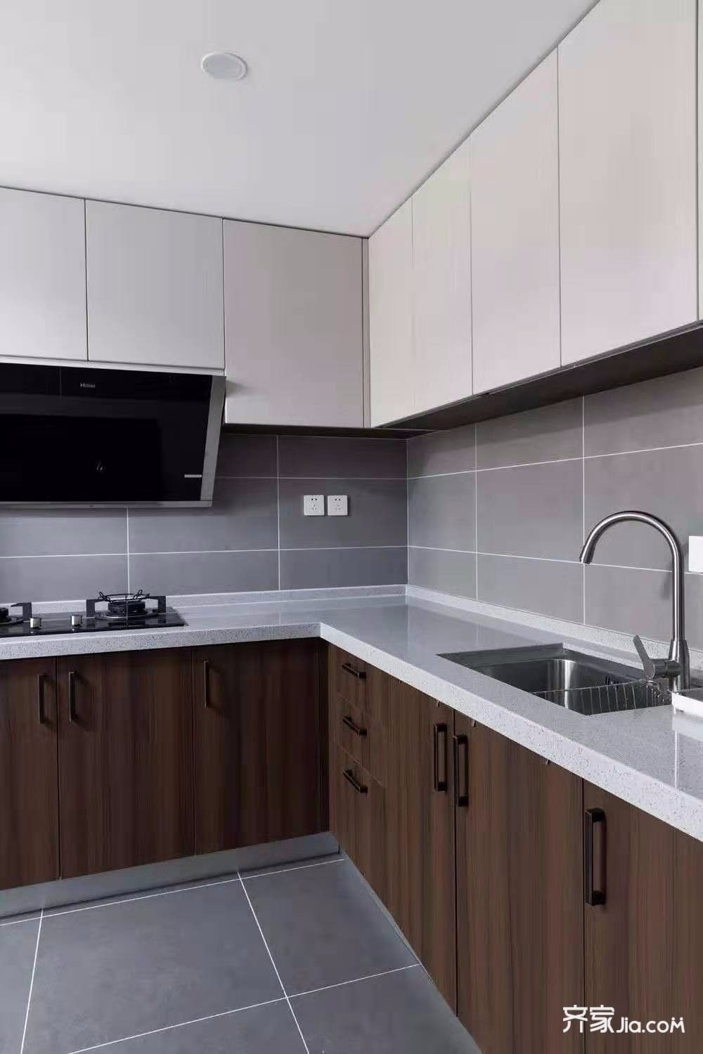 厨房整体灰色墙地砖,灰色台面搭配深棕色橱柜,白色吊柜,简约大方