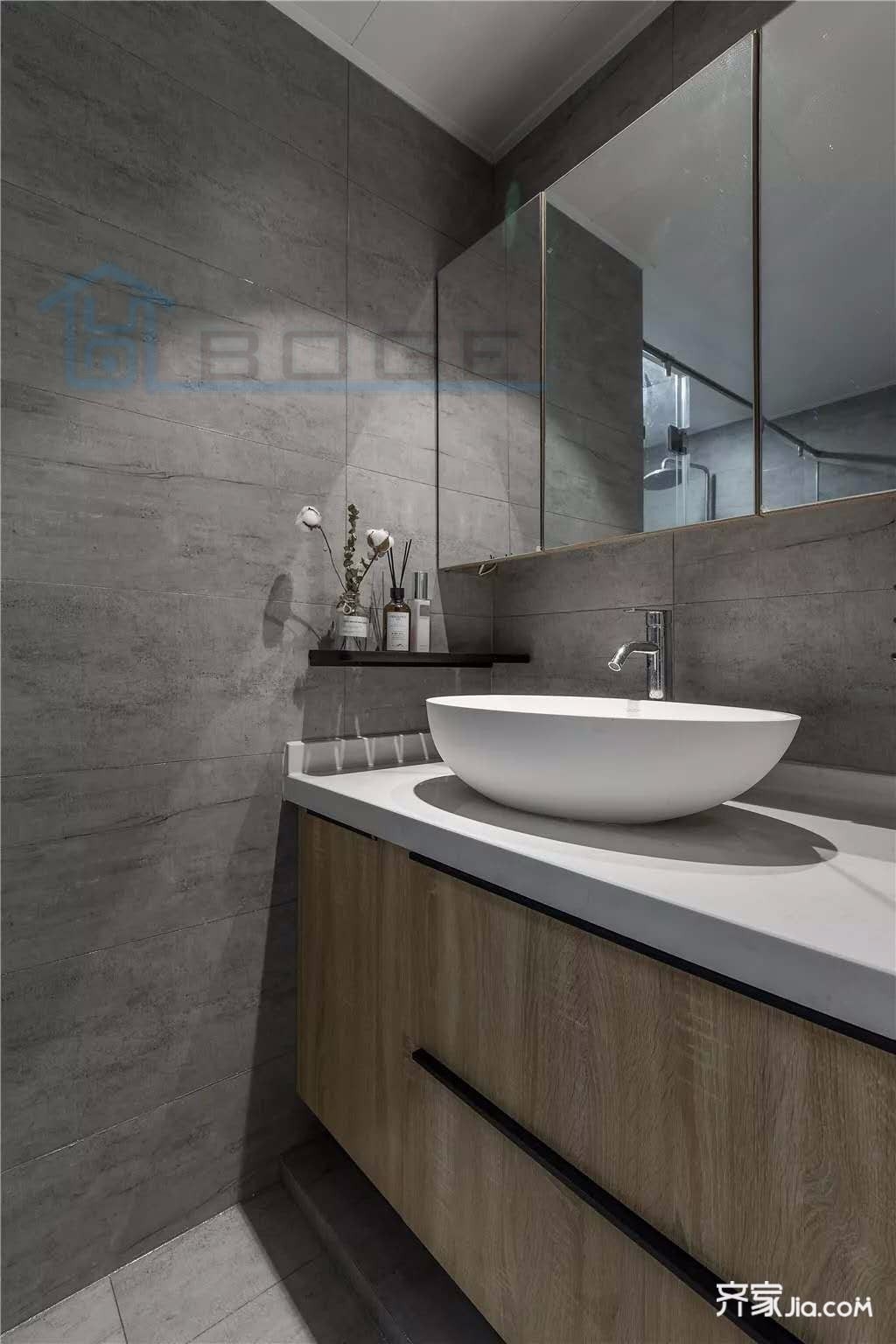 卫生间与整体空间一样运用灰色系,木色的电视柜